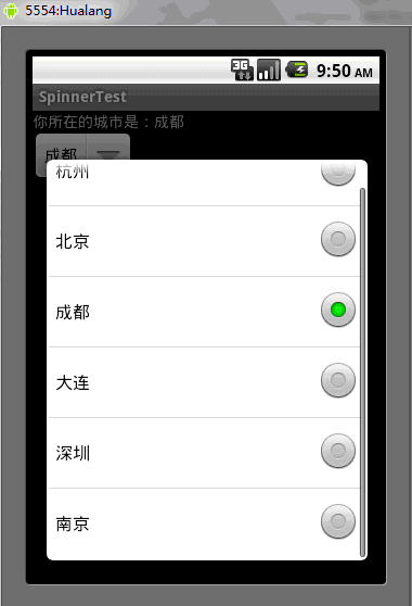 <?xml version="1.0" encoding="utf-8"?> <LinearLayout xmlns:android="http://schemas.android.com/apk/res/android" android:orientation="vertical" android:layout_width="fill_parent" android:layout_height="fill_parent" > <TextView android:id="@+id/text" android:layout_width="fill_parent" android:layout_height="wrap_content" android:text="您所在的城市" /> <Spinner android:id="@+id/spinner" android:layout_width="wrap_content" android:layout_height="wrap_content" android:layout_centerHorizontal="true" /> </LinearLayout>