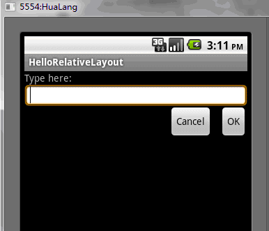 <?xml version="1.0" encoding="utf-8"?> <RelativeLayout xmlns:android="http://schemas.android.com/apk/res/android" android:orientation="vertical" android:layout_width="fill_parent" android:layout_height="fill_parent" > <TextView android:id="@+id/label" android:layout_width="fill_parent" android:layout_height="wrap_content" android:text="Type here:" /> <EditText android:id="@+id/entry" android:layout_width="fill_parent" android:layout_height="wrap_content" android:background="@android:drawable/editbox_background" android:layout_below="@id/label" /> <Button android:id="@+id/ok" android:layout_width="wrap_content" android:layout_height="wrap_content" android:layout_below="@id/entry" android:layout_alignParentRight="true" android:layout_marginLeft="10dip" android:text="OK" /> <Button android:layout_width="wrap_content" android:layout_height="wrap_content" android:layout_toLeftOf="@id/ok" android:layout_alignTop="@id/ok" android:text="Cancel" /> </RelativeLayout>