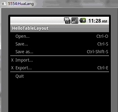 <?xml version="1.0" encoding="utf-8"?> <TableLayout xmlns:android="http://schemas.android.com/apk/res/android" android:layout_width="fill_parent" android:layout_height="fill_parent" android:stretchColumns="1"> <TableRow> <TextView android:layout_column="1" android:text="Open..." android:padding="3dip" /> <TextView android:text="Ctrl-O" android:gravity="right" android:padding="3dip" /> </TableRow> <TableRow> <TextView android:layout_column="1" android:text="Save..." android:padding="3dip" /> <TextView android:text="Ctrl-S" android:gravity="right" android:padding="3dip" /> </TableRow> <TableRow> <TextView android:layout_column="1" android:text="Save as..." android:padding="3dip" /> <TextView android:text="Ctrl-Shift-S" android:gravity="right" android:padding="3dip" /> </TableRow> <View android:layout_height="2dip" android:background="#FF909090" /> <TableRow> <TextView android:text="X" android:padding="3dip" /> <TextView android:text="Import..." android:padding="3dip" /> </TableRow> <TableRow> <TextView android:text="X" android:padding="3dip" /> <TextView android:text="Export..." android:padding="3dip" /> <TextView android:text="Ctrl-E" android:gravity="right" android:padding="3dip" /> </TableRow> <View android:layout_height="2dip" android:background="#FF909090" /> <TableRow> <TextView android:layout_column="1" android:text="Quit" android:padding="3dip" /> </TableRow> </TableLayout>