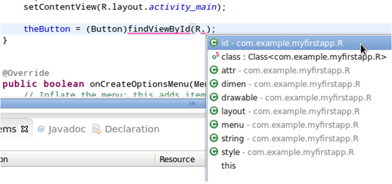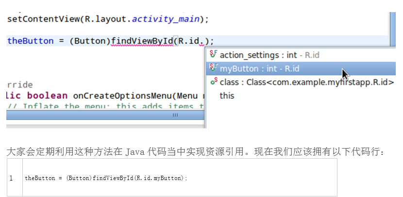 輸入另一個句號“.”——Eclipse會顯示現有ID值列表。目前我們只添加了一個ID值,選擇我們為Button設置的ID名稱——也就是“myButton”。