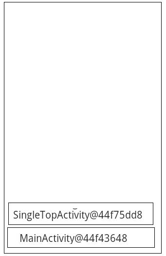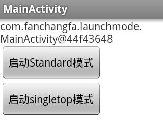 當我們在上面界面中點擊”啟動singleTop模式”按鈕時,由於此Activity設置的啟動模式為singleTop,因此它首先會 檢測當前棧頂是否為我們要請求的Activity對象,經驗證成立,因此它不會創建新的Activity,而是引用當前棧頂的Activity。