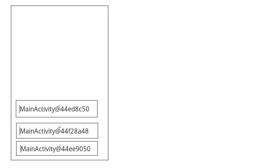 當點擊按鈕時,會創建新的Activity,通過TextView@後16進制數的顯示即可看出,點擊兩次分別界面如下: