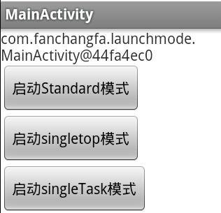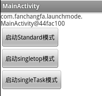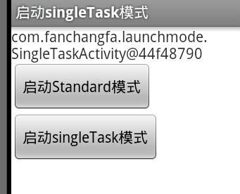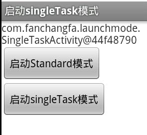 在此界面中點擊第二個按鈕”啟動singleTask模式”按鈕,根據定義會檢測當前棧中是否有此Activity對象,因此顯示的還是當前的Activity,不會重新創建;