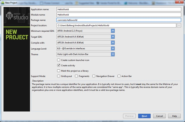 由於我們需要從零開始,因此這裡選擇“新項目”。這時大家會看到一份選項列表,旨在對我們的新項目作出配置。在今天的教程中,我們將創建一款簡單的應用程序,主要目的是為大家演示Android Studio中最為重要的一部分功能特性。相信大家也和我一樣,會認為“HelloWorld”這個名稱最適合本次開發出的新項目。