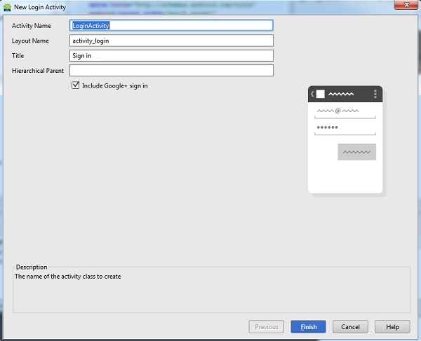 如大家在上面的截圖中所見,我已經將新建的Activity命名為LoginActivity——也就是為activity login設定Layout Name——並為該Activity添加了一個名為Sign In的標題。在默認情況下,對話框中的Include Google+ sign in項目已經被勾選。由於我們不打算在今天的示例中使用Google+登錄功能,因此取消該勾選項。