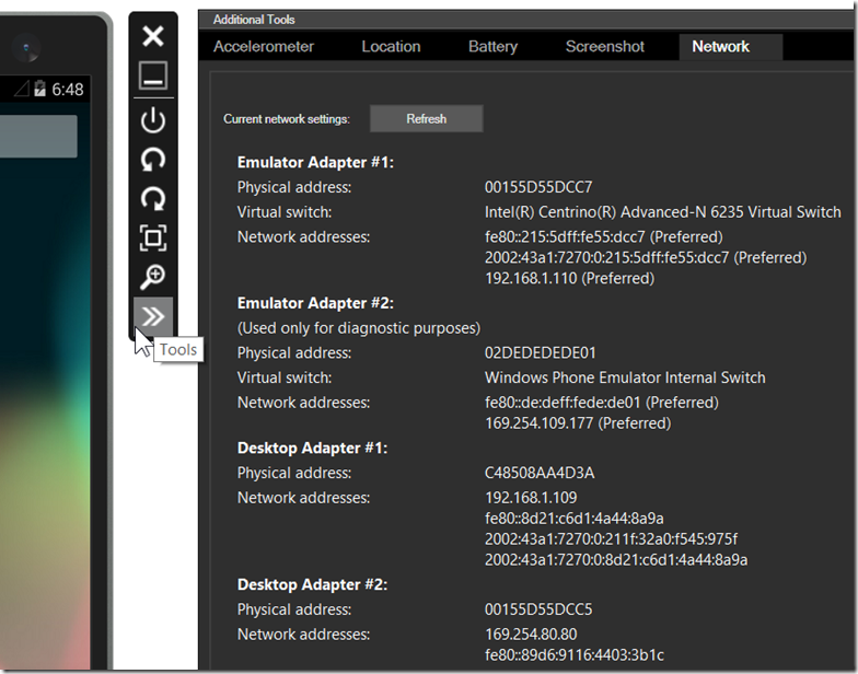 Shell/Chrome,提供了用戶交互界面,可以用它來裝載虛擬鏡像並將其進行渲染顯示出來。可以把這個過程和遠程桌面做一下類比:其實你就是遠程連接到一個本地鏡像上。我們的工作就是從這裡開始,直接借鑒了Windows Phone模擬器(我們內部稱其為XDE)的shell/chrome。 然後根據Android的特殊需求,做了一些必要的修改。