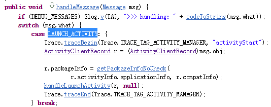 觀察它的handleMessage()方法,發現了其中有一個what值為LAUNCH_ACTIVITY的switch分支,其中調用了handleLaunchActivity()方法。