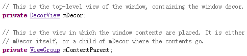 PhoneWindow類中有兩個和視圖相關的成員變量,一個是DecorView mDecor,另一個是ViewGroup mContentParent。