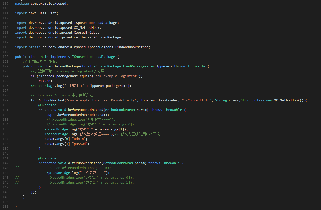 看代碼中的注釋,主要是三個方法的調用,handleLoadPackage,主要是獲取到android包的相關信息,這裡由於只是對logintest進行hook,做下簡單的判斷。
