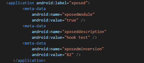 聲明這個是xposed模塊,名稱為hook test 並且使用api版本號是82