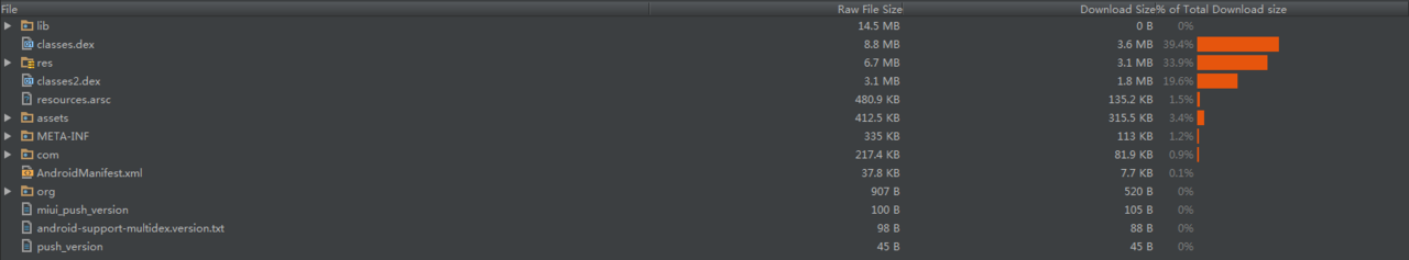 其中,在安裝包中占比較大的包括:dex文件、res文件夾、assets文件夾、lib文件夾以及resource.arsc文件。所以,接下來的瘦身優化就是讓這些文件變小,以此達到瘦身的目的。