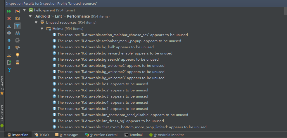 即可看到所有未使用的資源文件,建議定期清理掉這些沒用的文件,一方面可以減小工程的大小,另一方面太多的資源文件會導致打包後 resources.arsc 文件變得越來越大,公司有一項目 resources.arsc 文件已經達到 2-3 MB 的程度,有點驚人。
