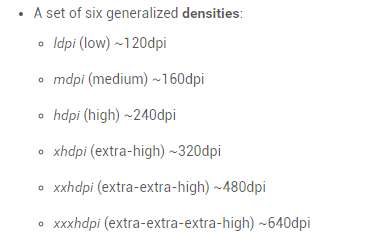 開發目錄下會有個 drawable 或者 mipmap 目錄用於適配不同 dpi 的屏幕,下面是不同命名目錄所適配的 dpi 范圍