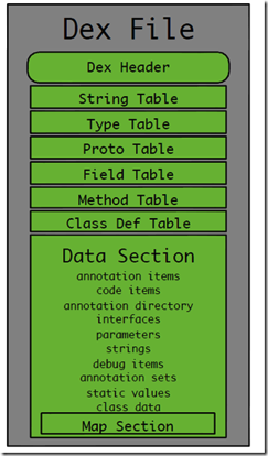 根據上文的分析,我們知道dex文件大致有3個部分(這裡3個部分主要用於分析,勿較真):