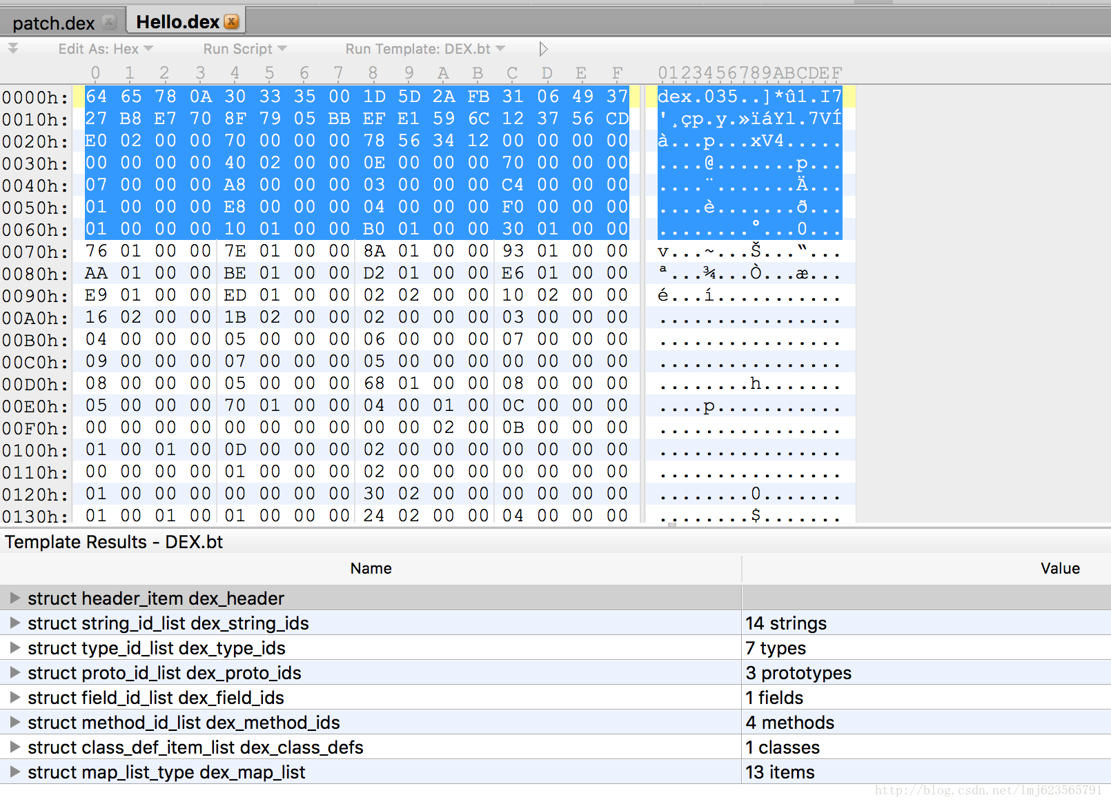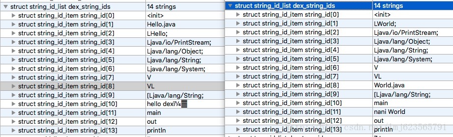 使用010 Editor分別打開兩個dex,我們主要關注string_id_item;