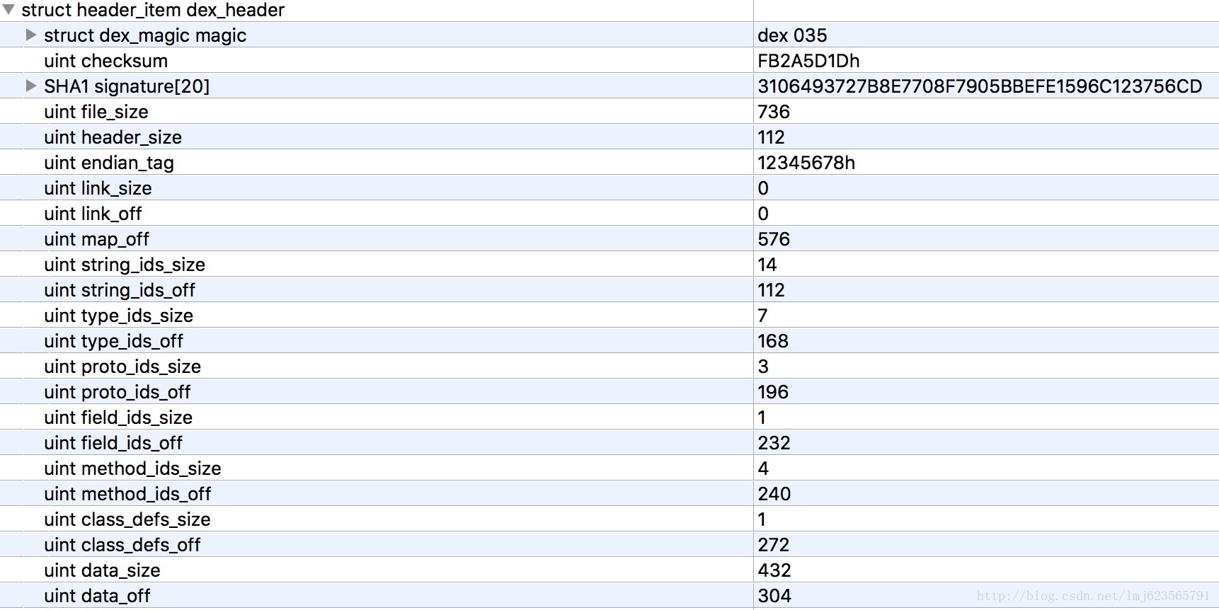 這樣的好處就是,當虛擬機讀取dex文件時,只需要讀取出header部分,就可以知道dex文件的大致區塊分布了;並且可以檢驗出該文件格式是否正確、文件是否被篡改等。