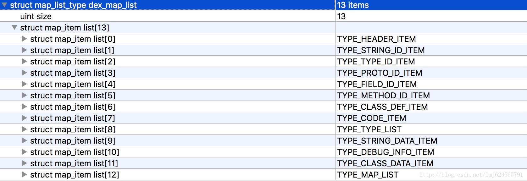 這樣的話,可以看出通過map_list,可以將一個完整的dex文件劃分成固定的區域(本例為13),且知道每個區域的開始,以及該區域對應的數據格式的個數。