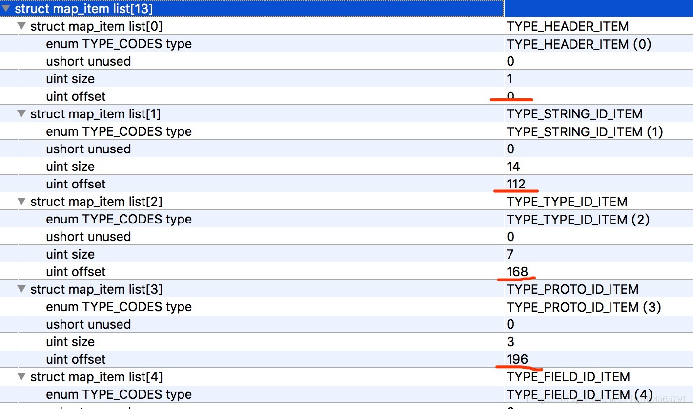 可以看到每個map_list_item包含一個枚舉類型,一個2字節暫未使用的成員、一個size表明當前類型的個數,offset表明當前類型偏移量。