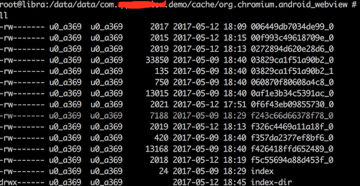 實際上,以5.1系統為例,我看到了/data/data/包名/cache/org.chromium.android_webview/下面有叫index和/index-dir/the-real-index的文件,以及一堆名稱為md5+下劃線+數字的文件,上面的圖中也可以看得到,這塊的原理仍然有些疑問,也希望專業的大神可以解答一下。