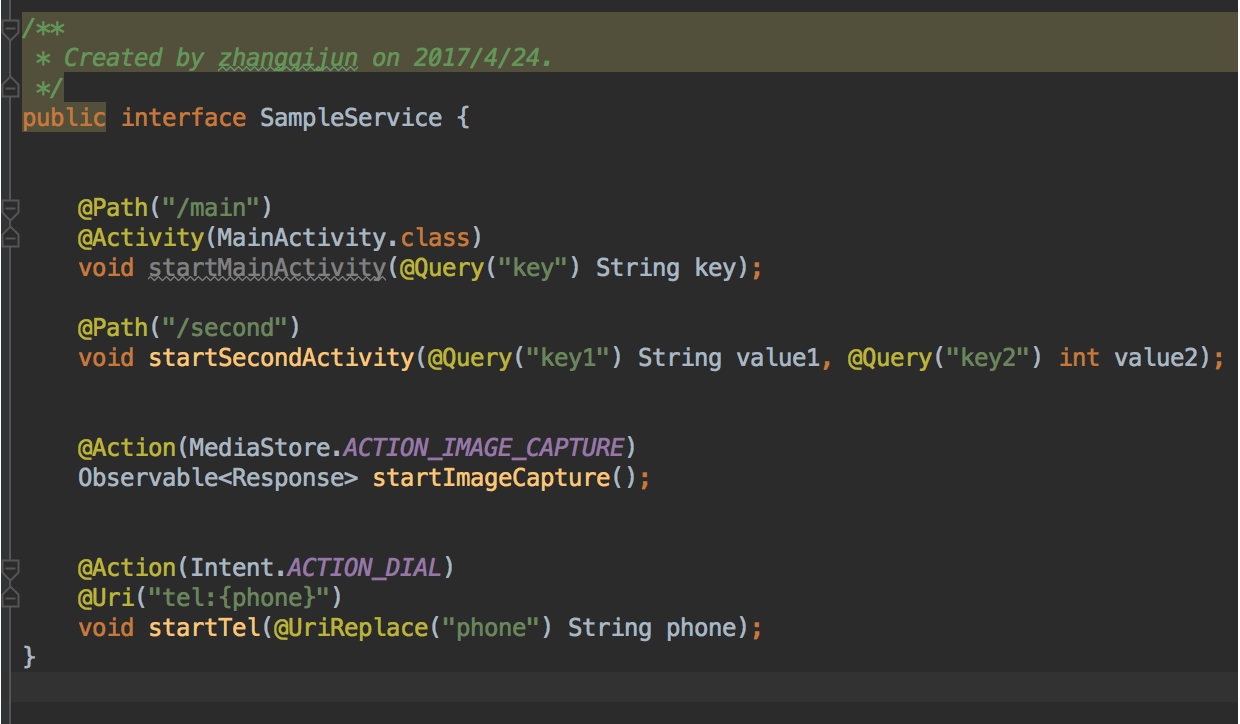 大部分路由庫都是手動拼參數調用路由的,這裡模仿了Retrofit接口式調用,受了LiteRouter的啟發,不過Retrofit使用了動態代理,我使用的Apt沒有性能損耗。