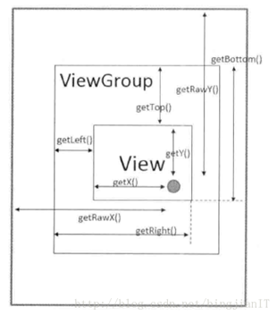 從上面的兩張圖可以看出,Android坐標系的坐標原點位於屏幕的左上角,而視圖坐標系的原點位於父視圖的左上角,既然提供了兩種不同的坐標系,那麼我們如何來獲取坐標呢,Android已經給我們提供了一些方法用於獲取這些坐標,看下面的圖便一目了然。