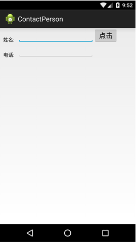 <?xml version="1.0" encoding="utf-8"?> <LinearLayout xmlns:android="http://schemas.android.com/apk/res/android" android:layout_width="match_parent" android:layout_height="match_parent" android:orientation="vertical" > <LinearLayout android:layout_width="fill_parent" android:layout_height="40dp" android:orientation="horizontal" > <TextView android:layout_width="wrap_content" android:layout_height="wrap_content" android:layout_gravity="bottom" android:paddingLeft="10dp" android:text="姓名:" android:textColor="@android:color/black" android:textSize="13sp" /> <EditText android:id="@+id/et_name" android:layout_width="200dp" android:layout_height="fill_parent" android:layout_marginLeft="10dp" /> <Button android:id="@+id/btn1" android:layout_width="wrap_content" android:layout_height="40dp" android:text="點擊" /> </LinearLayout> <LinearLayout android:layout_width="fill_parent" android:layout_height="40dp" android:orientation="horizontal" > <TextView android:layout_width="wrap_content" android:layout_height="wrap_content" android:layout_gravity="bottom" android:paddingLeft="10dp" android:text="電話:" android:textColor="@android:color/black" android:textSize="13sp" /> <EditText android:id="@+id/et_phone" android:layout_width="200dp" android:layout_height="fill_parent" android:layout_marginLeft="10dp" android:inputType="phone" /> </LinearLayout> </LinearLayout>