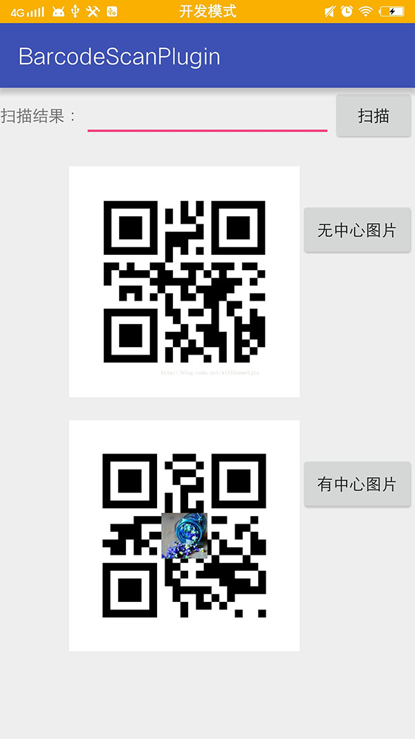 首先聲明我們通篇用的都是Google開源框架Zxing,要實現的功能有三個 ,生成普通二維碼、生成帶有中心圖片Logo 的二維碼,掃描解析二維碼,直接上效果圖吧