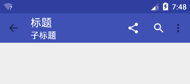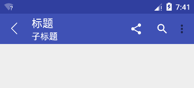 <android.support.v7.widget.Toolbar android:id="@+id/toolbar" android:layout_width="match_parent" android:layout_height="?attr/actionBarSize" android:background="@color/colorPrimary" app:navigationIcon="@mipmap/title_bar_back"//左側圖標 app:subtitle="子標題" app:subtitleTextColor="#fff" //標題顏色 app:title="標題" app:titleTextColor="#fff"/> //子標題顏色