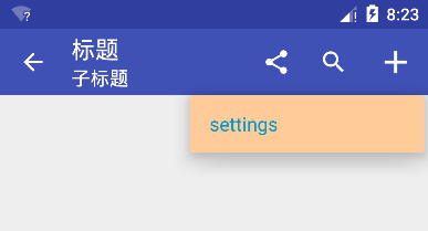 <menu xmlns:android="http://schemas.android.com/apk/res/android" xmlns:app="http://schemas.android.com/apk/res-auto" xmlns:tools="http://schemas.android.com/tools" tools:context=".MainActivity"> <item android:id="@+id/action_settings" android:icon="@mipmap/ic_launcher" android:orderInCategory="100" android:title="settings" app:showAsAction="never"/> <item android:id="@+id/action_share" android:icon="@mipmap/ic_action_share" android:orderInCategory="100" android:title="settings" app:showAsAction="ifRoom"/> <item android:id="@+id/action_search" android:icon="@mipmap/ic_action_search" android:orderInCategory="100" android:title="settings" app:showAsAction="ifRoom"/> </menu>