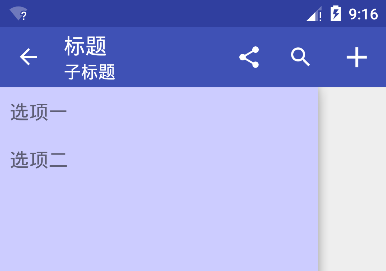 <?xml version="1.0" encoding="utf-8"?> <android.support.v4.widget.DrawerLayout xmlns:android="http://schemas.android.com/apk/res/android" android:id="@+id/drawer_left" android:layout_width="match_parent" android:layout_height="match_parent"> <!--側滑菜單--> <LinearLayout android:layout_width="match_parent" android:layout_height="match_parent" android:layout_gravity="start" android:background="#CCCCFF" android:orientation="vertical"> <TextView android:layout_width="match_parent" android:layout_height="wrap_content" android:padding="10dp" android:text="選項一" android:textSize="18sp"/> <TextView android:layout_width="match_parent" android:layout_height="wrap_content" android:padding="10dp" android:text="選項二" android:textSize="18sp"/> </LinearLayout> </android.support.v4.widget.DrawerLayout>