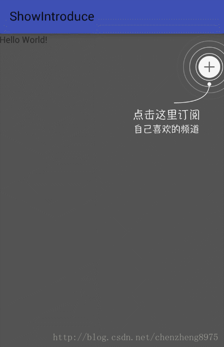 <?xml version="1.0" encoding="utf-8"?> <FrameLayout xmlns:android="http://schemas.android.com/apk/res/android" android:layout_width="match_parent" android:layout_height="match_parent"> <TextView android:layout_width="wrap_content" android:layout_height="wrap_content" android:text="Hello World!" /> <com.czhappy.showintroduce.view.RippleIntroView android:id="@+id/layout_ripple" android:layout_width="match_parent" android:layout_height="match_parent" android:clickable="true" android:fitsSystemWindows="true" android:background="#AA000000"> <ImageView android:id="@+id/iv_plus" android:layout_marginTop="36dp" android:src="@mipmap/ic_add" android:layout_alignParentRight="true" android:layout_marginRight="6dp" android:layout_width="wrap_content" android:layout_height="wrap_content"/> <ImageView android:src="@mipmap/tips_subscribe" android:id="@+id/tv_title" android:layout_below="@id/iv_plus" android:layout_marginTop="50dp" android:layout_alignParentRight="true" android:layout_marginRight="40dp" android:layout_width="wrap_content" android:layout_height="wrap_content"/> </com.czhappy.showintroduce.view.RippleIntroView> </FrameLayout>