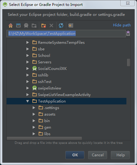 選擇Import project (Eclipse ADT, Gradle, etc.),進入項目選擇的對話框,注意這時就不是選擇要導入的項目,而是Eclipse工作目錄下的build.gradle文件: