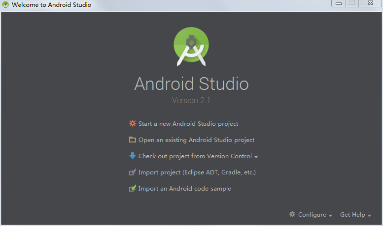 連續點擊"Finish",結束在Eclipse中的操作。進入Android Studio,同樣的關閉當前項目,進入Welcome對話框: