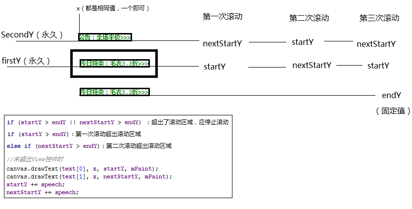 //初始化畫筆 mPaint = new Paint(); mPaint.setColor(Color.RED); mPaint.setTextSize(30); //測量文字的寬高,以第一句話為標准 Rect rect = new Rect(); mPaint.getTextBounds(text[0], 0, text[0].length(), rect); textWidth = rect.width(); textHeight = rect.height(); //文字開始的x,y坐標 //由於文字是以基准線為基線的,文字底部會突出一點,所以向上收5px x = getX() + getPaddingLeft(); startY = getTop() + textHeight + getPaddingTop() - 5; //文字結束的x,y坐標 endY = startY + textHeight + getPaddingBottom(); //下一個文字滾動開始的y坐標 //由於文字是以基准線為基線的,文字底部會突出一點,所以向上收5px nextStartY = getTop() - 5; //記錄開始的坐標 firstY = startY; secondY = nextStartY;