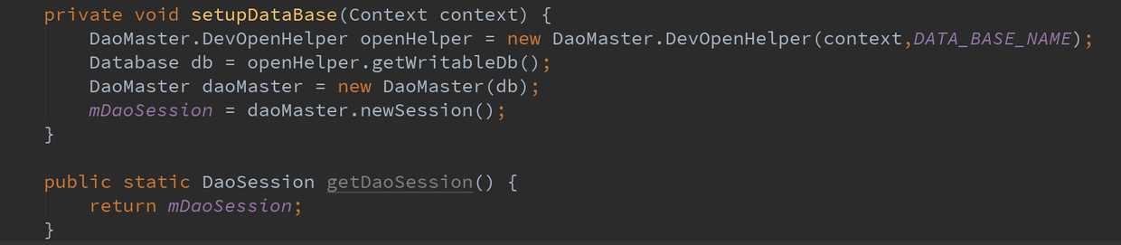 context上下文這個不用多說,name數據庫的名字,cursorFactory游標工廠,一般不用,傳入null或者使用兩個參數的方法即可。我們對外提供一個getDaoSession()的方法供外部使用。