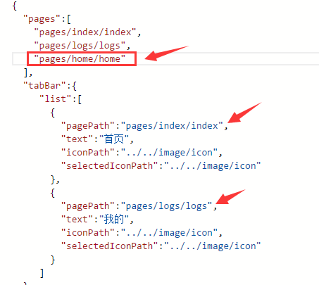 【注意】此處注意兩個關鍵詞 “應用內的頁面” 和 “tabBar頁面”。 app.json文件中tabBar中注冊過的tab頁,即為“tabBar頁面”,非tabBar中注冊占用的頁面即為“應用內的頁面” 。 如下圖:home頁面為“應用內的頁面”,index和logs頁面則為 “tabBar頁面”。