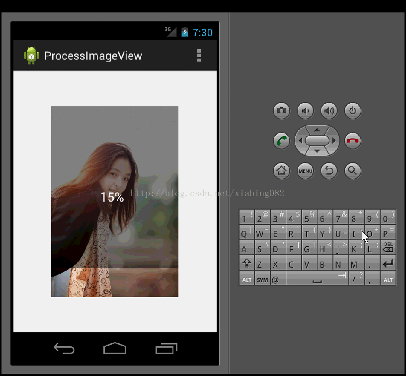 首先從圖中可以看到 中間有個參數變化,這個進度值不斷變化,我們再activity 中使用了一個線程 ,每隔0.2 秒會增加progress這個值,然後通過 processImageView.setProgress(progress); 改變view類中 progress重繪制這個定義view.