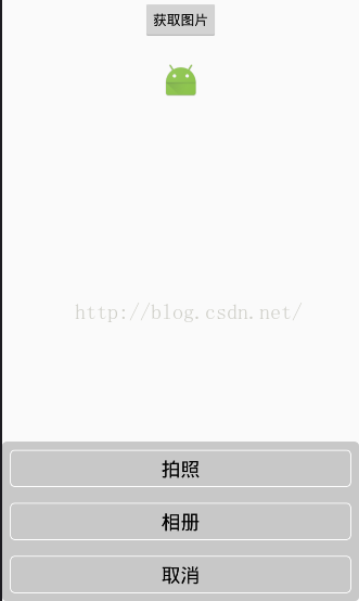 從系統相冊中選擇照片或則調用系統相機。大部分的項目都會用到,我進行了一下封裝,仿ios的效果。效果如下:1、Camera的基類package com.zhang.test