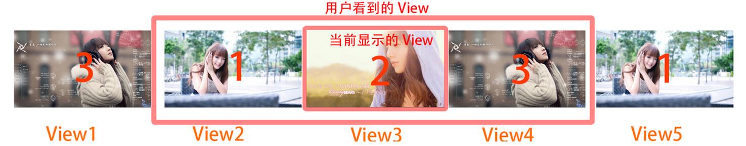 雖然看到的是三張圖 實際上是五張 數據多的時候也按照這種方式添加數據 當view4的時候自動切換到view5時 進行判斷讓到切換到view2 這樣造成的感覺就是最後一張下來是第一張