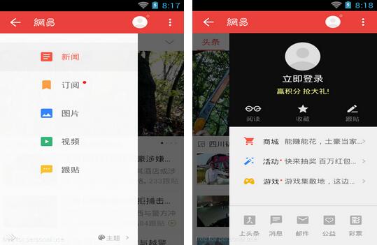 這裡用“網易新聞”客戶端v4.4的截圖來說明一下,這個DrawerLayout抽屜式布局是什麼樣子的。