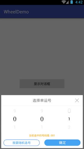 先看下利用wheelview實現滾動隨機選擇號碼效果: