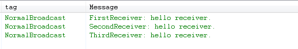 再次點擊發送按鈕,我們會發現,控制台中三個接收者仍然都打印了自己的日志,表明接收者並不能終止廣播。