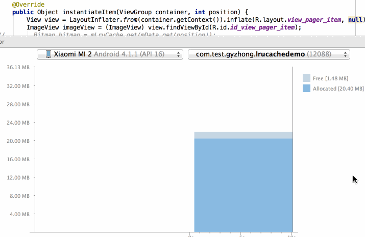 以上內存分析圖所分析的是同一個應用的數據,唯一不同的是圖-1沒有使用 LruCache,而圖-2使用了 LruCache;可以非常明顯的看到,圖-1的內存使用明顯偏大,基本上都是在30M左右,而圖-2的內存使用情況基本上在20M左右。這就足足省了將近10M的內存!
