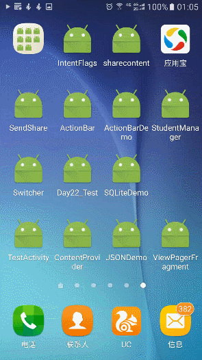 那如果將他們兩結合起來,會不會擦出點火花呢,答案是肯定的。之前在介紹ViewPager時,我們實現了多個ImageView的切換,並配合更新導航原點的狀態。那我們現在就將之前的imageview替換為fragment,將導航原點替換為更加生動的布局,比如我們經常使用的微信(取消了ActionBar):