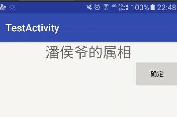<?xml version="1.0" encoding="utf-8"?> <LinearLayout xmlns:android="http://schemas.android.com/apk/res/android" xmlns:tools="http://schemas.android.com/tools" android:id="@+id/activity_main" android:layout_width="match_parent" android:layout_height="match_parent" android:orientation="vertical" tools:context="com.example.administrator.testactivity.MainActivity"> <TextView android:id="@+id/tv1" android:layout_width="match_parent" android:layout_height="wrap_content" android:hint="潘侯爺的屬相" android:gravity="center" android:textSize="30sp"/> <Button android:id="@+id/btn1" android:layout_width="wrap_content" android:layout_height="wrap_content" android:layout_gravity="right" android:text="確定"/> </LinearLayout>