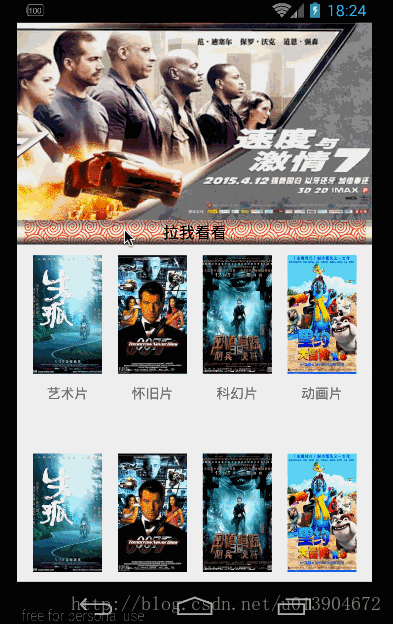 然後看一下畫軸點擊移動時候的背景圖,是跟隨畫軸移動,動態改變高度的.這個用一個ImageView來搞定,設置ImageView的scaleType就可以了,不過這個地方有一些小問題,下面會說.
