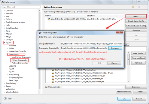 Window-preferences-PyDev-Jython Interpreter中,New一個Jython,路徑選擇sdk\tools\ jython-standalone-2.5.3.jar,點擊OK。