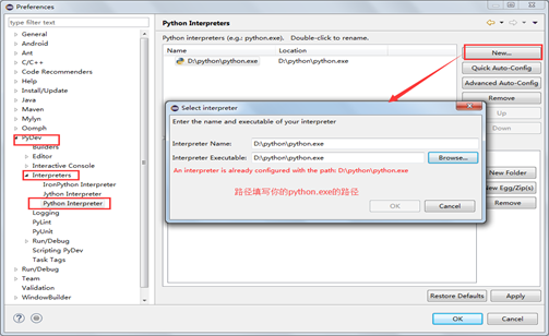 Window-preferences-PyDev-Python Interpreter中,New一個python解釋器,路徑選擇你的python.exe,點擊OK。