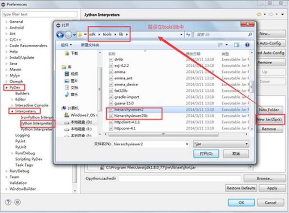 在window-preference-PyDev-Jython Interpreter中,點擊右邊的"New Jar/Zips"按鈕,開始選擇你的SDK下面的\tools\lib下面你需要用到的Jar包。下面是我們這次所需要的Jar包:hierarchyviewer2.jar、hierarchyviewer2lib.jar、monkeyrunner.jar、chimpchat.jar,將這些Jar包依次加入即可。