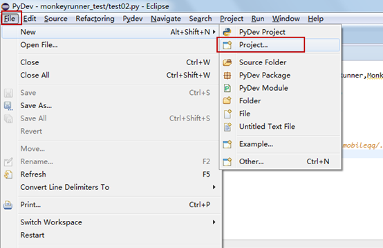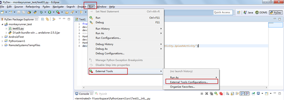 實際上執行這段代碼,需要Android提供的monkeyrunner.bat,所以不能像平常運行程序一樣,因此接下來要配置eclipse中Monkeyrunner腳本的運行。